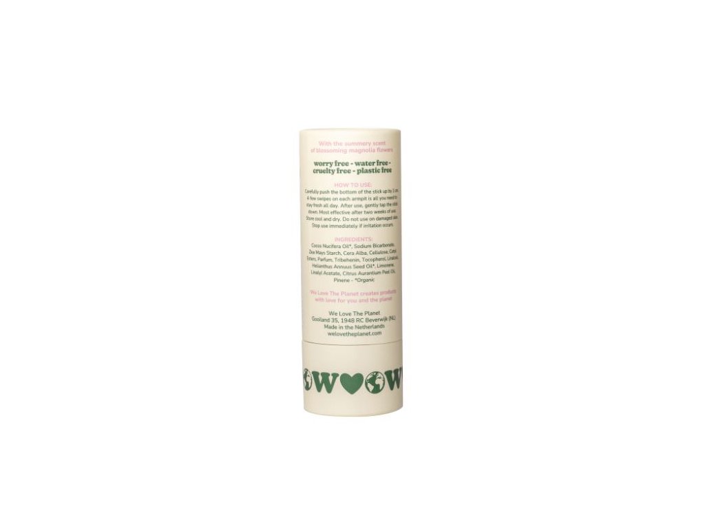 We Love The Planet je holandská značka, ktorá vyrába 100 % prírodné deodoranty, šetrné k pokožke aj životnému prostrediu. V ich zložení nenájdete hliníkové soli, parabény ani syntetické parfumy – namiesto toho obsahujú len prírodné ingrediencie, ktoré účinne neutralizujú zápach a starajú sa o citlivú pokožku.